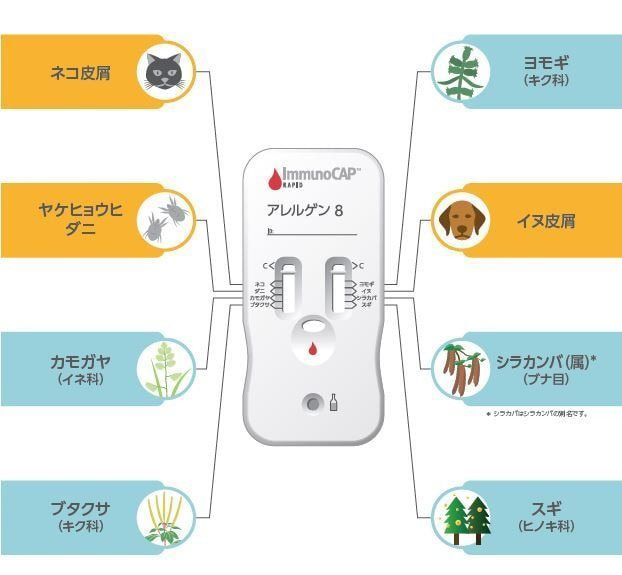 スギ、シラカンバ、ダニなど8種のアレルギーの原因を知ることができます。